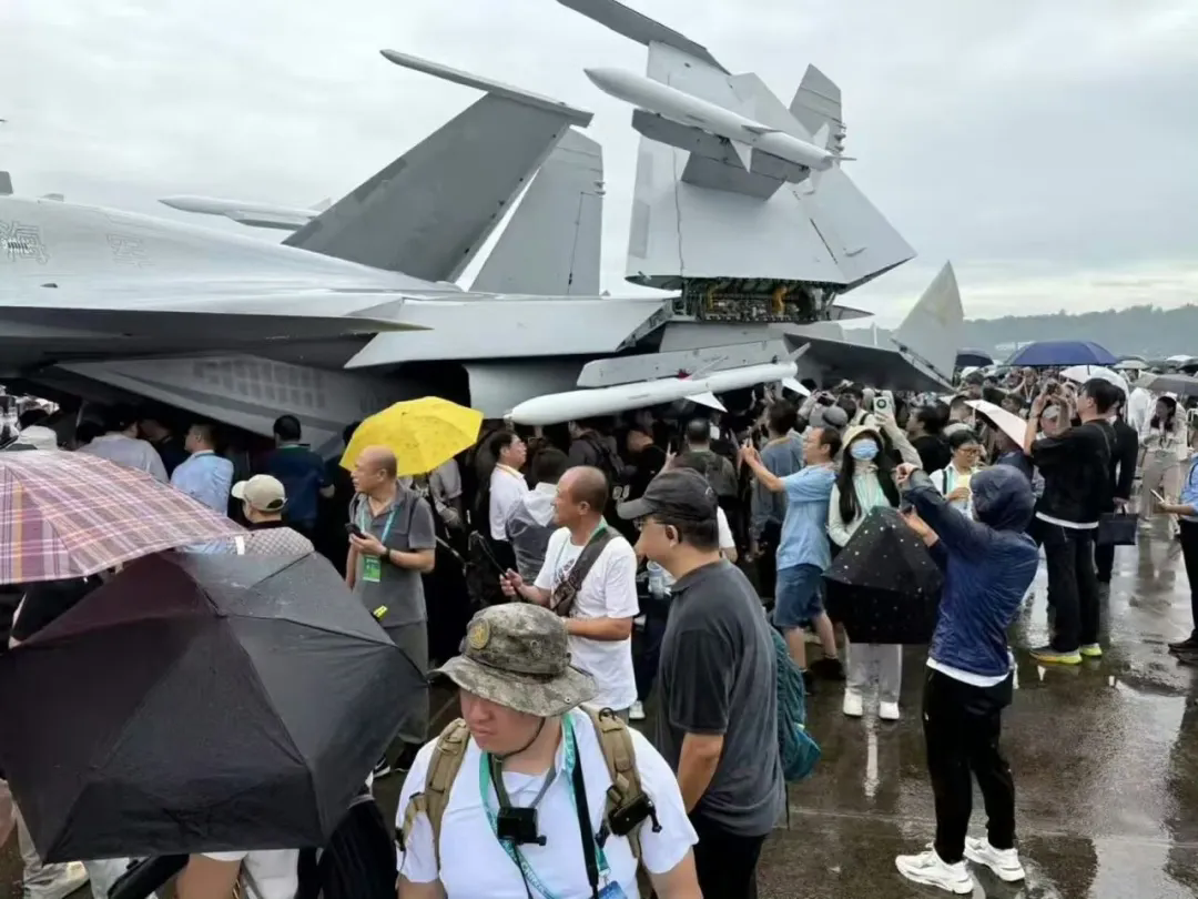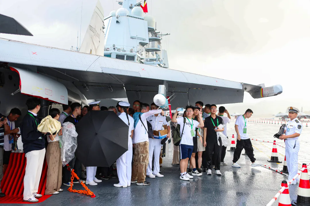 2024年11月13日,中国航展期间,歼15T“珠海”撑伞,为民众遮风避雨;2025年7月5日,山东舰开放期间,歼15T再次成为避风港。